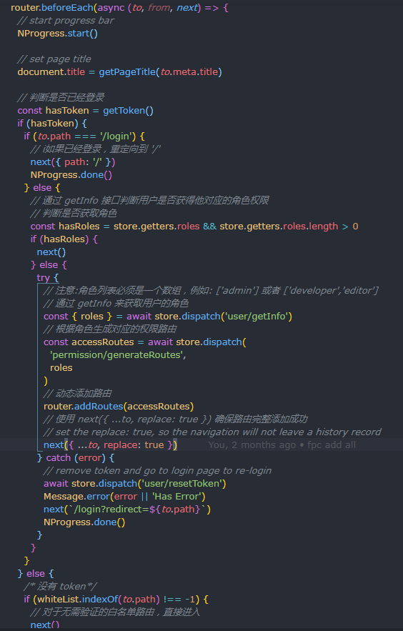 然后在路由前置守卫中使用 getInfo 来获取用户角色