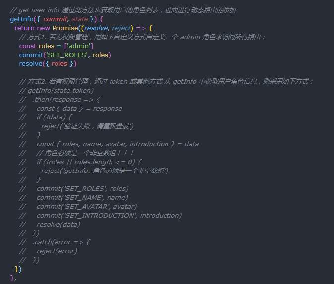 vue-admin-template 的 角色必须是一个非空的数组, 比如:['admin'] ['admin','editor','manager'] 咱们自己的项目有些没有角 色管理,有些带角色管理返回的可能只是一个简单的 roleType 字符串,这种情况直接跟后端说,好添加 就添加一个字段,不好添加, 前端根据返回信息自己造个数组就行了。 vue-admin-template 的角色是哦通过 getInfo 获取的,咱们 可能登录的时候就给了,这个我 都在关键部分做了注释,根据情况灵活运用。